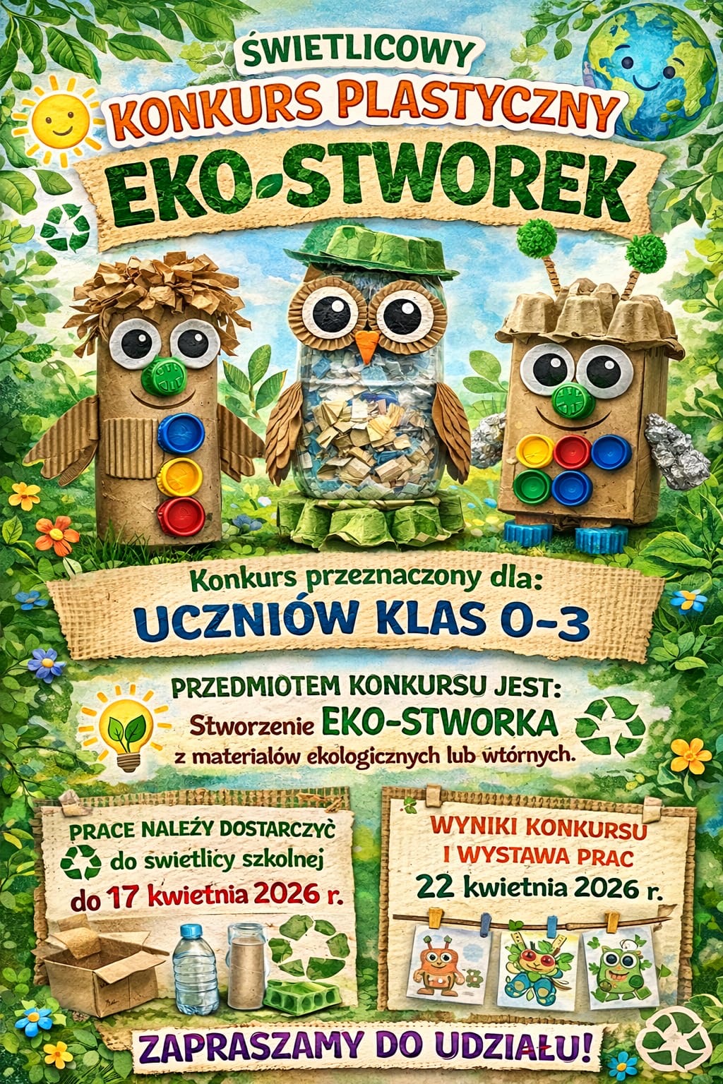 Serdecznie zapraszamy uczniów klas 0–3 do udziału w świetlicowym konkursie plastycznym „Eko-Stworek”. Zadaniem uczestników jest wykonanie pracy przedstawiającej eko-stwora z materiałów ekologicznych lub surowców wtórnych.